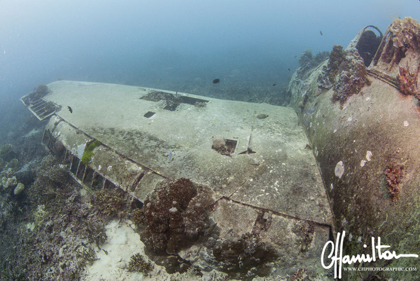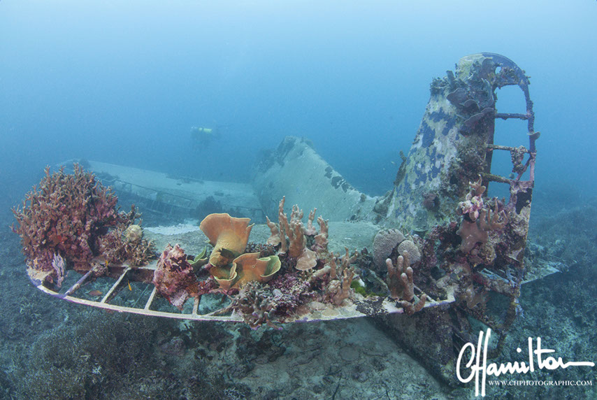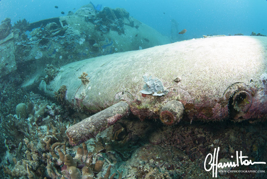 This Hellcat was discovered intact off Quomu Island by Danny Kennedy, owner of Dive Gizo in 1986. The plane was in remarkable condition, even the navigation charts in the cockpit.