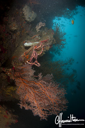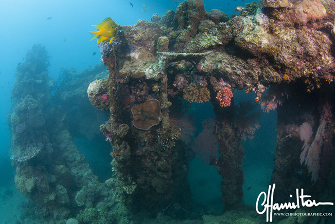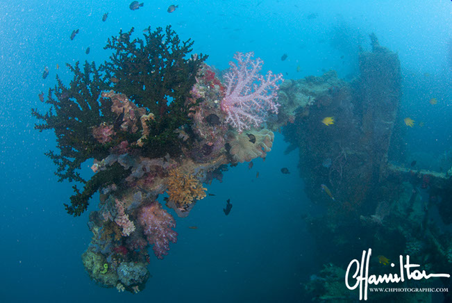 The Hirokawa Maru was a cargo ship for the Kawasaki Line before she began her military career, cut short by a American raid on November 14th, 1942. She was sunk off a white sand beach just north of Honiara where she lies today, semi exposed. Despite the shallow waters in which she rest and numerous salvage raids, the wreck maintains an impressive structure, and supports a stunning forest of soft coral.