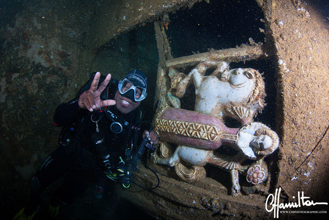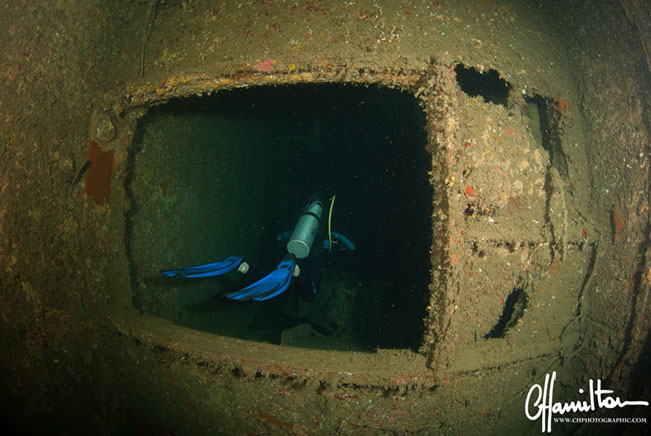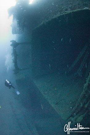 The SS President Coolidge, a luxury liner turned troop carrier sunk near Espiritu Santo in Vanuatu after faltering into friendly mines in October 1942.  Almost 200 meters in length and 25 meters at the beam, this wreck can be dived innumerable times and still offer new and fascinating sights.