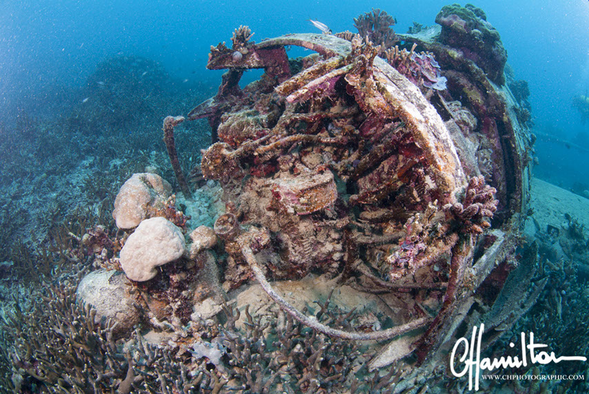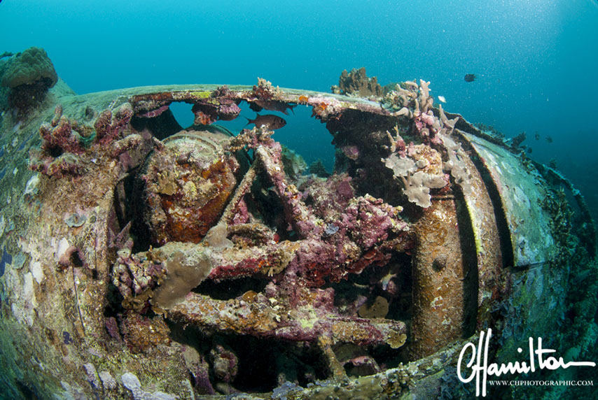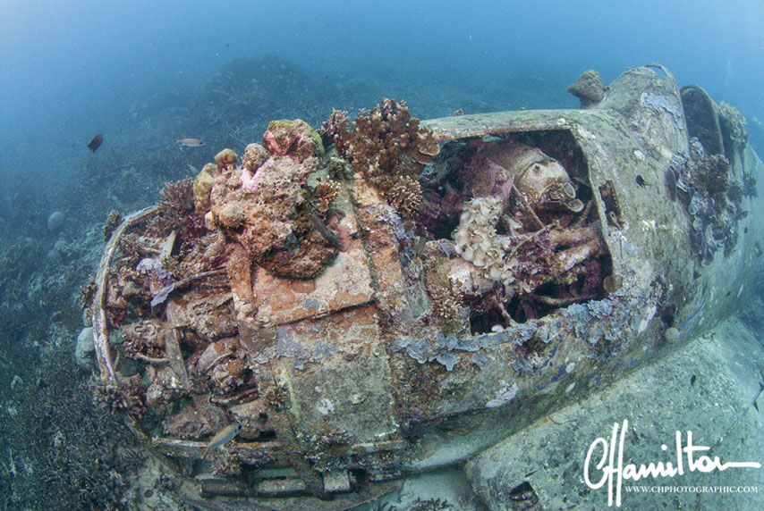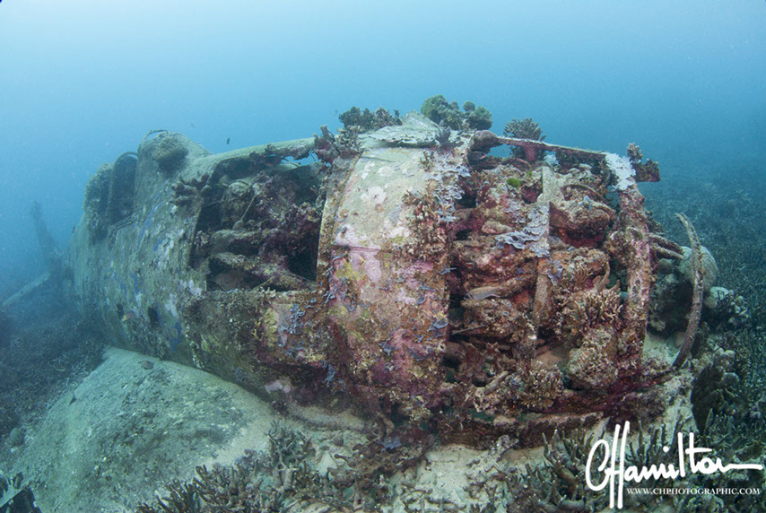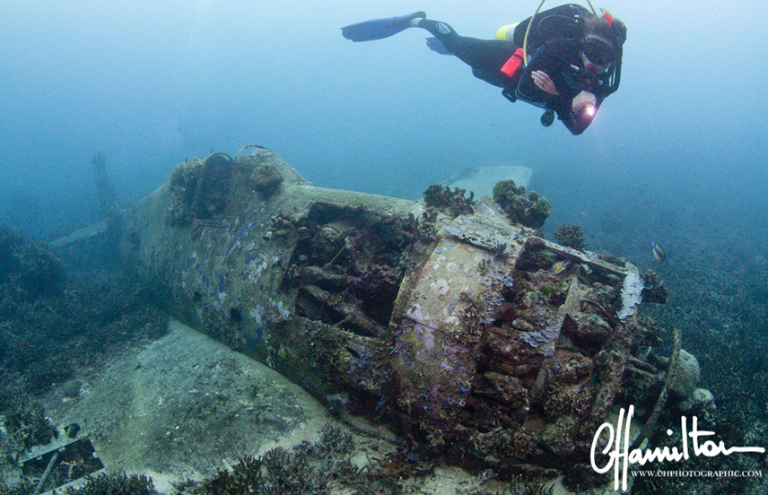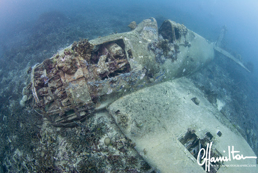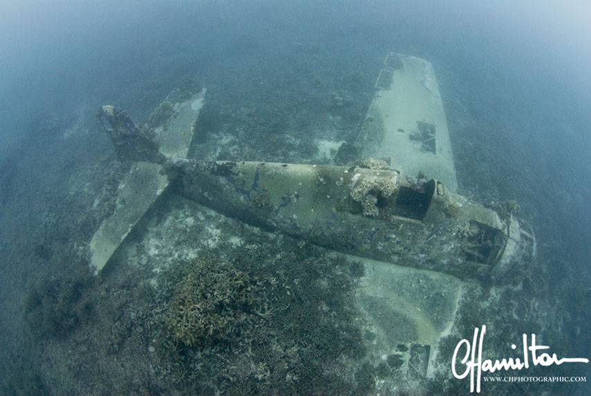 This Hellcat was discovered intact off Quomu Island by Danny Kennedy, owner of Dive Gizo in 1986. The plane was in remarkable condition, even the navigation charts in the cockpit.