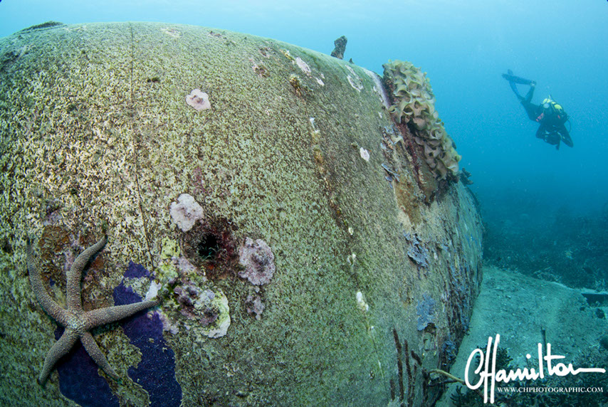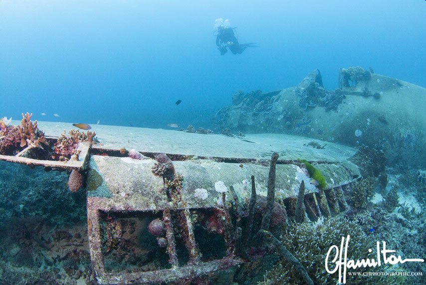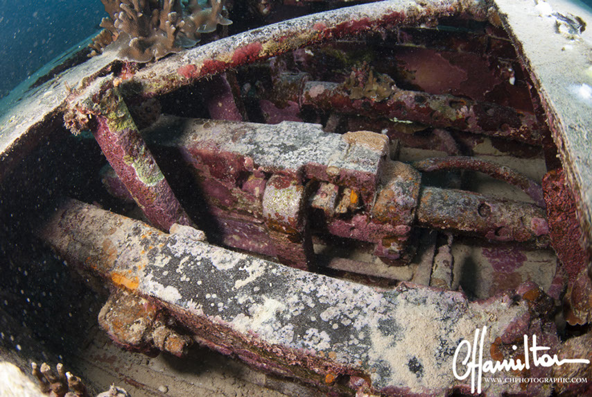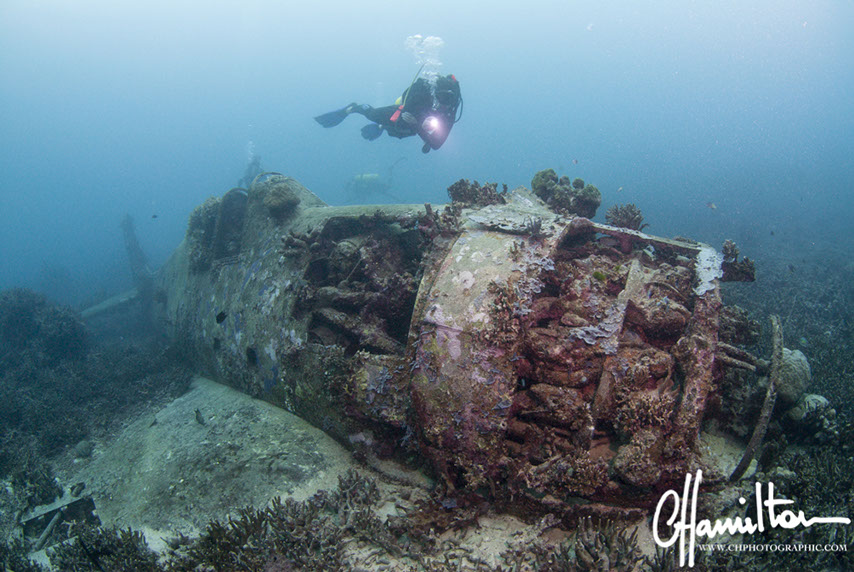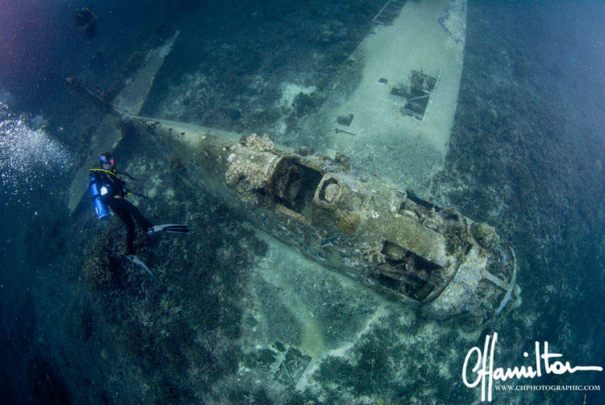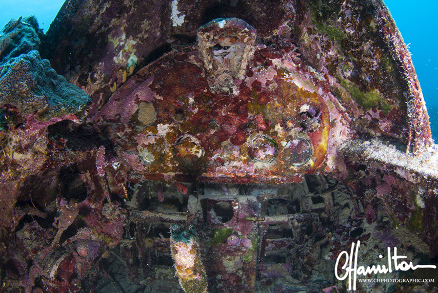 This Hellcat was discovered intact off Quomu Island by Danny Kennedy, owner of Dive Gizo in 1986. The plane was in remarkable condition, even the navigation charts in the cockpit.