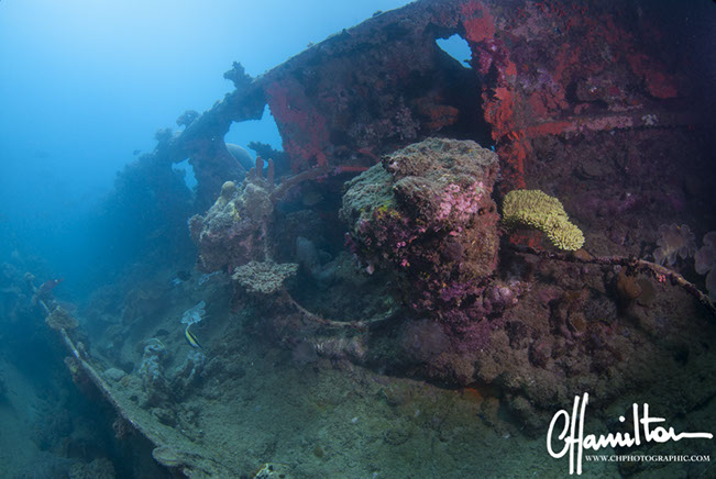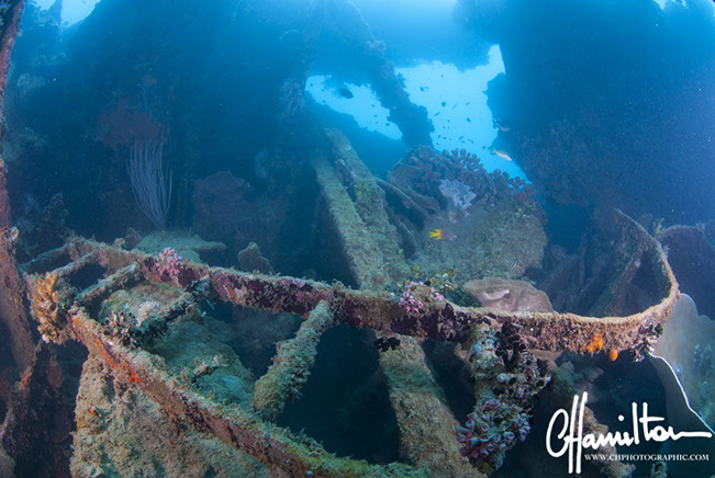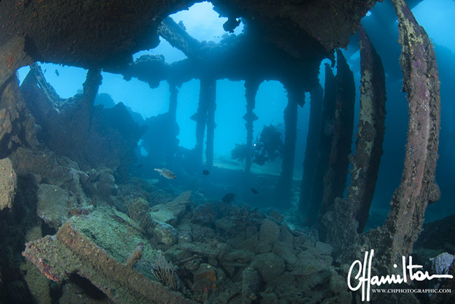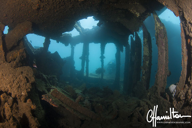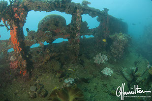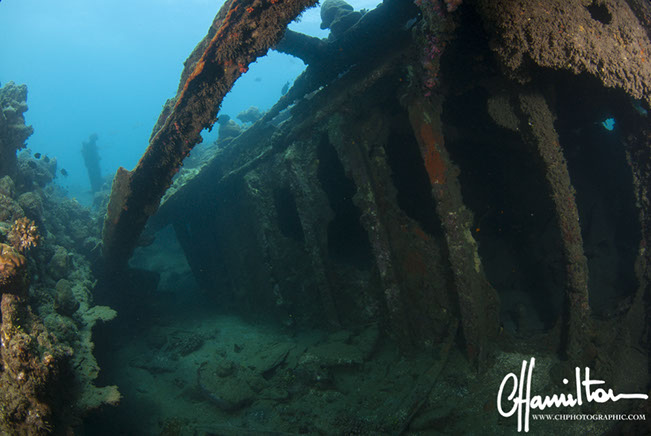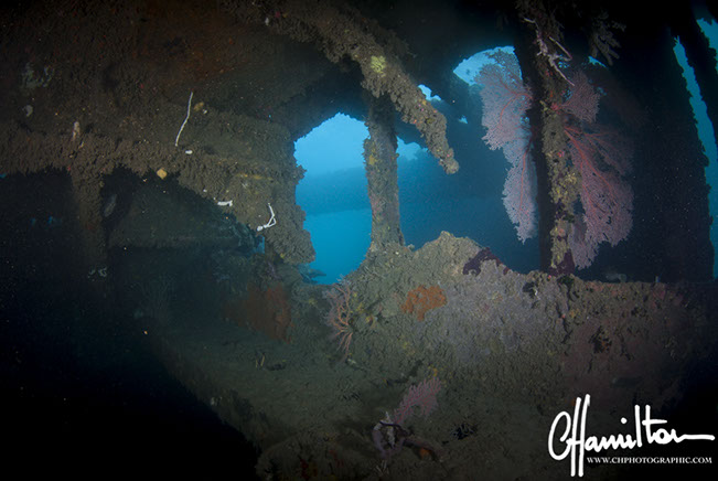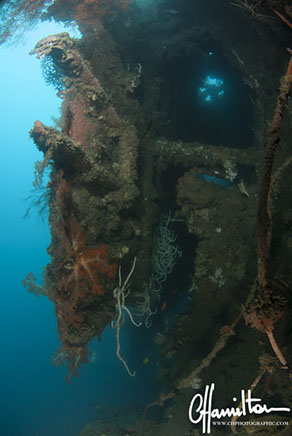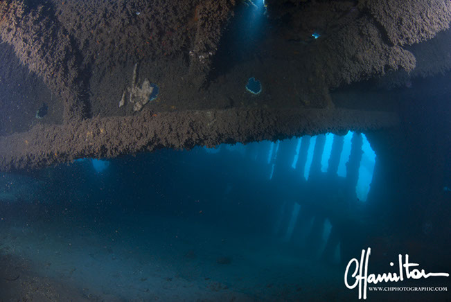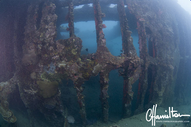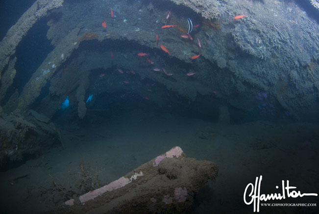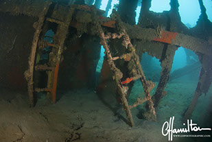 The wreck lies on its port side at an angle of 45 degrees, running from 3 metres down to just over 45 metres.