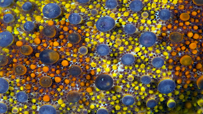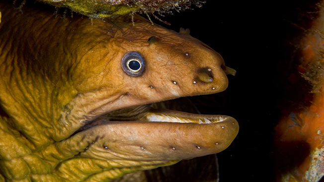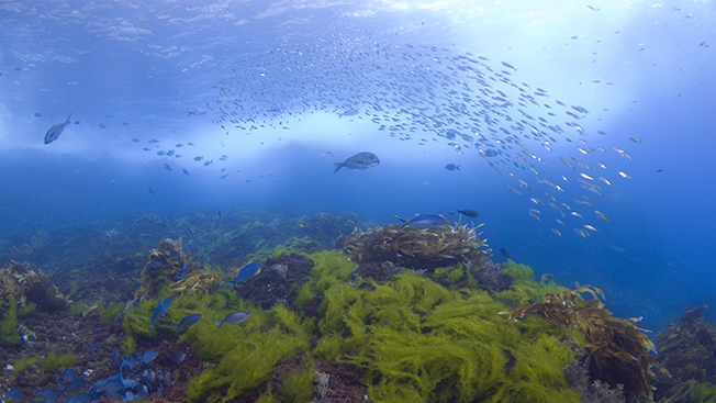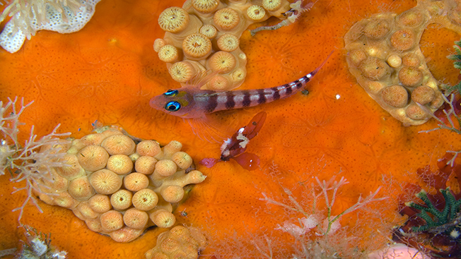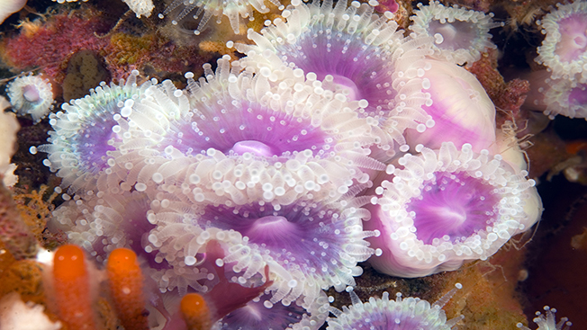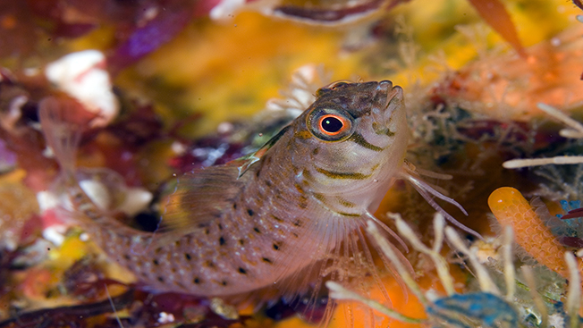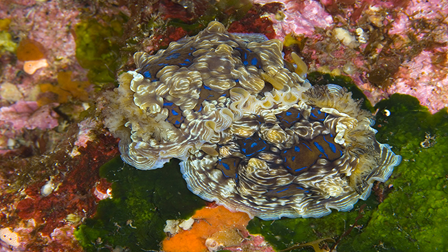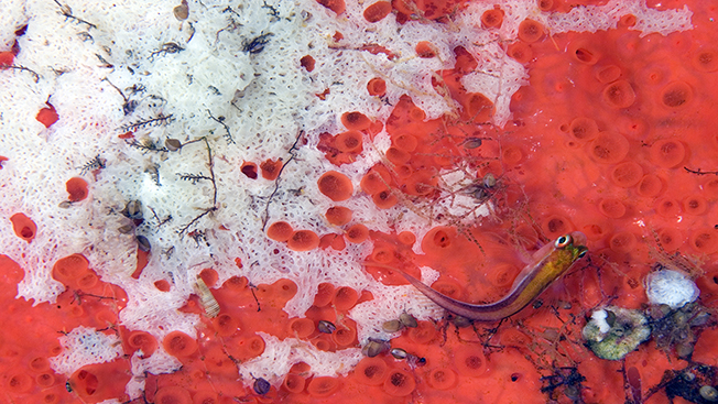 The Poor Knights lie close to the continental shelf and its upwelling of nutrient-rich waters. This lush food source flows close to the Islands and provides a continuous supply of food for filter feeders. Archways and vertical walls are thick with an astonishing array of encrusting life that support an incredible bio-mass of fish and other invertebrates. The shady recesses of archways and caves offer a haven to species usually only found at depth, and act as safe havens for juveniles. In the protected back recesses of Rikoriko Cave a sponge usually found only at 200 metres thrives just 10 metres below the surface.