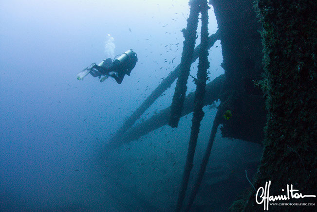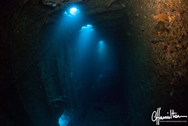 The SS President Coolidge, a luxury liner turned troop carrier sunk near Espiritu Santo in Vanuatu after faltering into friendly mines in October 1942. Almost 200 meters in length and 25 meters at the beam, this wreck can be dived innumerable times and still offer new and fascinating sights.
